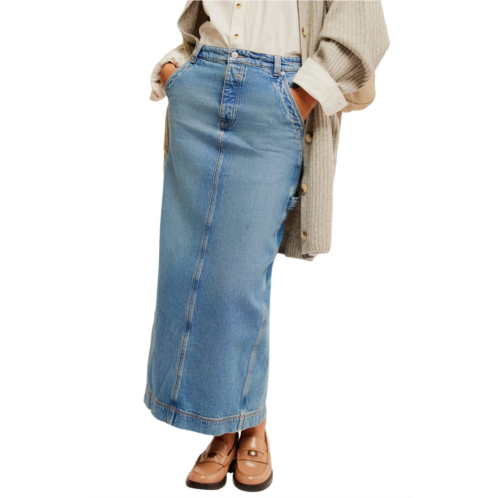 Tuck in your favorite tee for a more casual yet feminine look.Elevate your seasonal wardrobe with the Free People Francisco Denim Maxi Skirt, designed for women in the alluring color 'Head Over Heels.' Crafted from 100% cotton denim, this vintage-inspired piece features a solid pattern and nonstretch construction, making it perfect for fall. The skirt is 28 inches in length with a zip fly and button closure, complete with front slant pockets and back patch pockets, adding functionality to the stylish design. Care is simple - machine wash and dry flat, ensuring longevity and comfort.