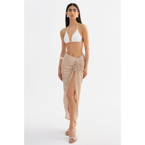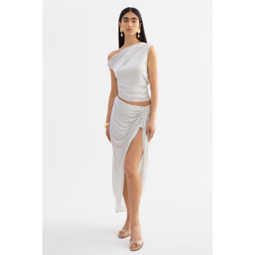 The SANNA Maxi Skirt is an effortlessly elegant piece designed with movement in mind. Featuring a high-waisted fit and crafted from metallic knit fabric, this skirt showcases a curved waist detail, front pleated accents, and a thigh-high slit for added fluidity. A concealed back elastic completes the sleek design, making it an elevated essential for any occasion.