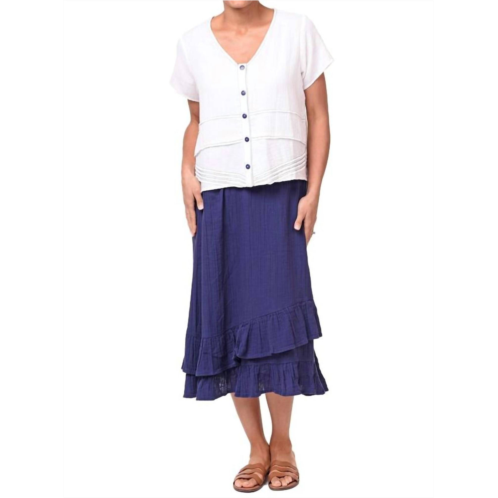 Show off just the right amount of skin in this beautifuly designed midi length skirt.Introducing the Erika Skirt by Tulip Clothing, a chic midi crafted from 100% cotton for lightweight comfort. This stylish piece features a flat front and elastic back, complete with front pockets and a graceful two-ruffle hem. Pull on style. Machine wash and hang to dry. Model is wearing a size small.
