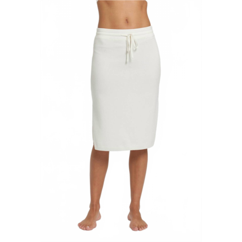 Show off just the right amount of skin in this beautifuly designed midi length skirt.Elevate your warm-weather wardrobe with the Women's Malibu Skirt by LEIMERE in Marshmallow. This solid midi skirt comes with a cozy drawstring waist and stylish side slits, making it perfect for a spring dinner party. Made from a luxurious blend - 50% Modal, 25% Cotton, 15% Nylon, and 10% Cashmere. Imported with a pull-on closure for effortless wear. Care - Hand wash and lay flat to dry, but it can also be machine washed on a gentle cycle with like colors, tumble dry low. Model is 5'10' and wearing a size Small (29' Waist, 23.75' Length).