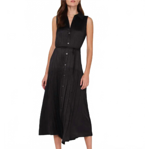 Just add slides or mules and you are good to go.Introducing the Tracy Black Pleated Midi Dress by Current Air, perfect for a sophisticated dinner party or celebrating the 4th of July. This sleeveless shirt dress is expertly crafted with 100% polyester, showcasing a solid black, maximalist design. Featuring a pleated silhouette and a V-neckline for added elegance, it fastens with a chic button closure. For best results, gently hand wash to maintain its pristine condition all summer long.