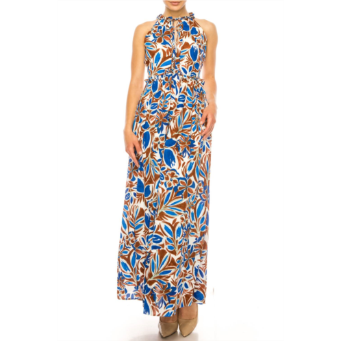 Style this maxi with your favorite statement necklace and sandals for the perfect look.Elevate your travel wardrobe with the Floral Halter Keyhole Maxi Dress by Maggy London, a boho chic choice ideal for Fall. This sleeveless dress is crafted from 100% polyester crepe chiffon in a striking white and royal blue floral pattern, featuring a stylish halter neckline and a long shift silhouette. Its pull-on closure with tie construction and practical hidden sock pockets add both style and functionality. For effortless maintenance, this maxi dress is machine washable, embodying easy care and elegance for any Thanksgiving occasion.