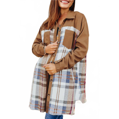 [US] 1 the Woman plaid patch work long sleeve shirt mini fall dress in brown