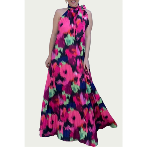 [US] ABBEY GLASS poppy pleated satin maxi dress in ikat roses
