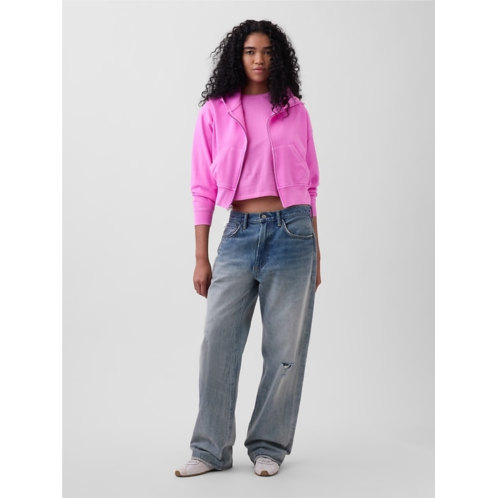 - Cropped, hits at the waist.