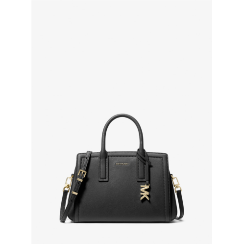 Satchel Pebbled leather 100% leather Trim - 75% polyurethane/25% polyester Gold-tone hardware 10”W X 7.25”H X 4.75”D Handle drop - 3.5” Interior details - back slip and zip pockets, center zip pocket Lining - 100% polyester Snap fastening Dust bag not included Imported