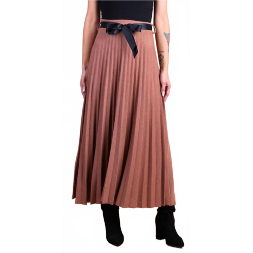 Who doesn't love a good maxi skirt?Experience the elegance of the GIGI MODA Di Lana Maxi Skirt, crafted in a chic Camel hue perfect for fall and holiday occasions. This mid-length skirt boasts a luxurious blend of 60% Viscose, 35% Wool, and 5% Elastane, featuring a pleated design with a comfortable elastic waist and a charming belted ribbon bow. Made in Italy, the skirt's pull-on closure offers ease of wear. Care instructions recommend hand washing and line drying to maintain its quality. One size fits all, ideal for a range of festive and workwear looks. Model is 5'7'.