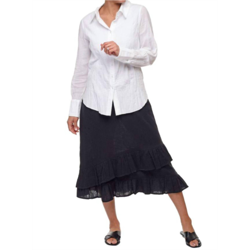 The midi length skirt is here to stay and we especially love this style.Introducing the Erika Skirt by Tulip Clothing, a chic black midi crafted from 100% cotton for lightweight comfort. This stylish piece features a flat front and elastic back, complete with front pockets and a graceful two-ruffle hem. Pull on style. Machine wash and hang to dry. Model is wearing a size small.