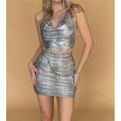 The Halogram Snake Dress Set by Black Bead is a stunning choice for any occasion. This women's skirt set, in a textured silver pattern, is beautifully crafted with self-composition of 95% Polyester and 5% Spandex, with a fully lined skirt using 95% Rayon and 5% Spandex. Offering a stylish tie closure and garment length of approximately 32 inches, this piece is designed to flatter. Imported and easy to care for, simply hand wash cold to maintain its elegance.