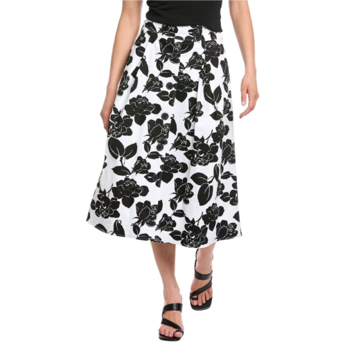 - Floral Mid Skirt In White And Black With Pleated Skirt, And Two Side Seam Pockets