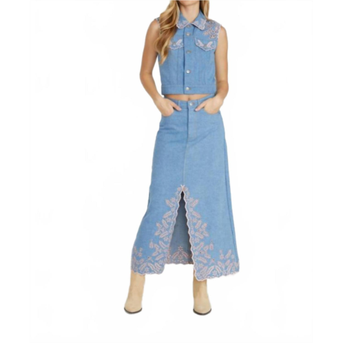 The midi length skirt is here to stay and we especially love this style.Indulge in the romantic charm of the Serena Skirt in Pink Promise. With its front slit and delicate eyelet embroidery, this serena skirt is perfect for making a statement. Complete the look with the matching vest for a touch of elegance.99% Cotton 1% SpandexMachine Wash Cold.Model is Wearing size 26.Style Number - DW-K43524A