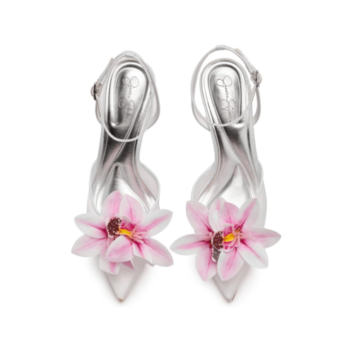 - The Jessica Simpson Vilyria 3D Floral Embellished High Heel is a gorgeous two-piece pump with a buckle adjustable ankle strap. It comes in a soft mesh material with a statement making orchid ornament.