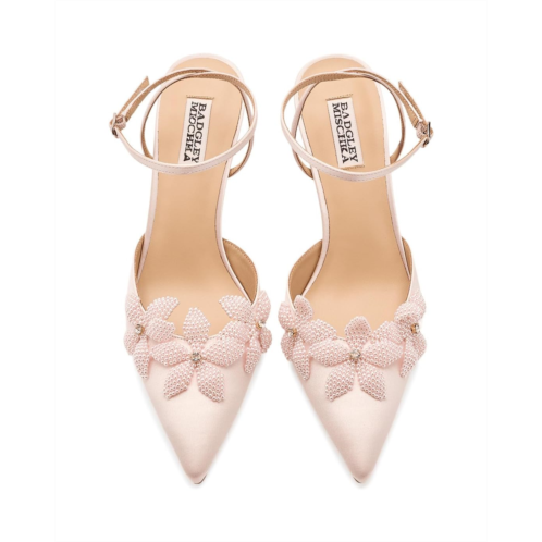 - Turn every step into a moment worth remembering wearing the Badgley Mischka Whitman Pumps. The pointed toe silhouette with pearl flower detailing on the textile upper adds an exquisite charm, while the tall stiletto heel elevates the height. Plus, the ankle strap and adjustable buckle closure ensure a secure fit.
