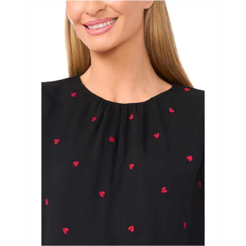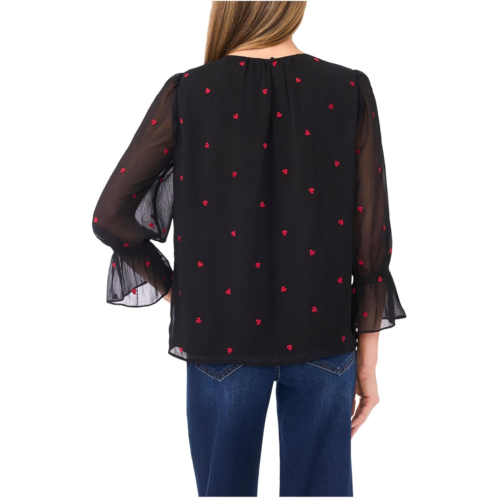 [US] Womens CeCe 3/4 Sleeve Shirred Neck Embroidery Hearts Top