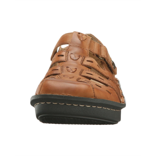 - Stylish embossed or burnished leather has a woven leather vamp for excellent ventilation and style.