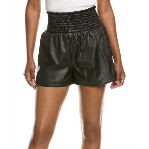 Introducing the Sportmax Bacio Leather Short from renowned brand SPORTMAX. These chic shorts are a must-have for any fashion-forward woman. Featuring a sleek black color and a stylish smocked waist design, these shorts are perfect for a night out or a casual day look. Made from 100% lamb leather with a comfortable lining of 97% polyester and 3% elastane, these shorts are both luxurious and practical. The inseam is approximately 3 inches with a 14-inch rise, and the model is 5'9 wearing a size 2. These shorts offer slip-on styling for easy wear and are dry clean only. Imported for the highest quality, these Sportmax Bacio Leather Shorts are a versatile addition to any wardrobe.