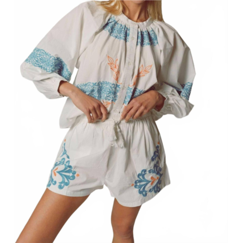 Tuck your favorite tee into these high-waist shorts for a more casual-cool feel.Introducing the Hannah Short by THE SHIRT, a versatile piece in a fresh White + Sky Detail colorway. These high-waist shorts feature a comfortable pull-on elastic waistband with a playful tassel rope drawstring. Crafted from breathable cotton, they showcase embroidered details, a scalloped hem, and handy side pockets for a touch of boho chic style. Care instructions - Machine wash and tumble dry for effortless maintenance. Perfect for summer vacations or a laid-back alfresco Thanksgiving.