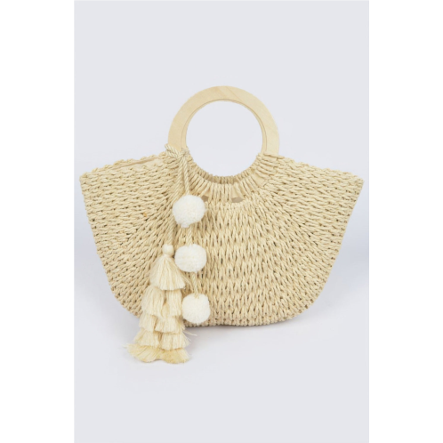 Elevate your everyday look with the Woven Cotton Wood Handle Tote Bag, a stylish accessory that blends texture, function, and flair. Crafted from woven paper with the appearance of cotton, this tote features smooth wooden handles and playful tassel accents that add a touch of boho charm. Its slim yet spacious design offers enough room for your daily essentials, making it ideal for beach days, brunch, or casual outings. The structured silhouette ensures durability while maintaining a lightweight feel. With its earthy tones and thoughtful details, this tote is a versatile staple for any season.