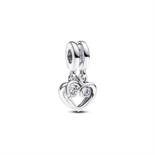 - Two hearts delicately intertwine forming a flowing shape which embraces a sparkling clear cubic zirconia.