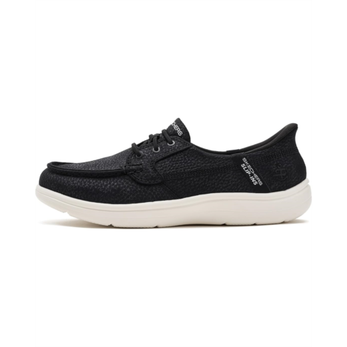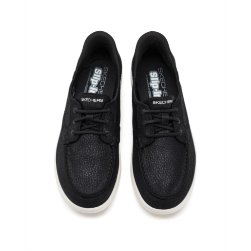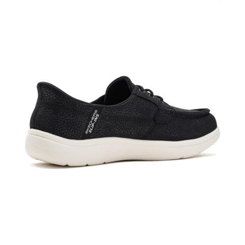 - Stylish and versatile comfort combine in the SKECHERS Hands Free Slip-Ins On-The-Go Flex Radiant - Brooklyn shoes. Designed with an exclusive Heel Pillow, these boat shoes feature a Perform Tex faux leather upper with fixed stretch laces, a high-rebound Skechers Air-Cooled Goga Mat ethylene vinyl acetate insole, and lightweight ULTRA GO cushioning. Their polyester lining provides all-day comfort. Machine washable, these slip-on shoes are crafted with 100% vegan materials.