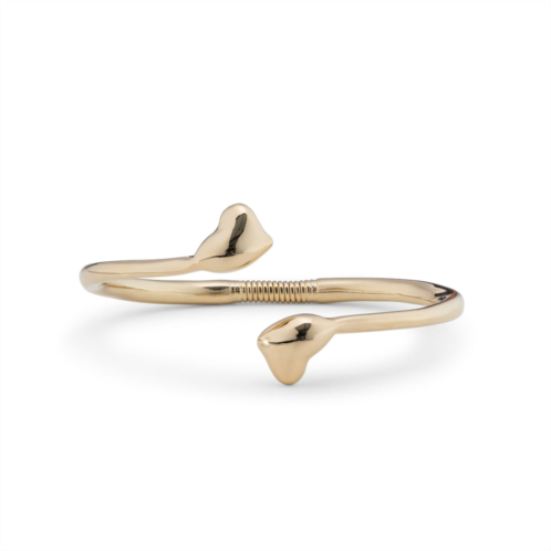- Two sculpted hearts sit at each end of this spring-loaded metal bracelet.