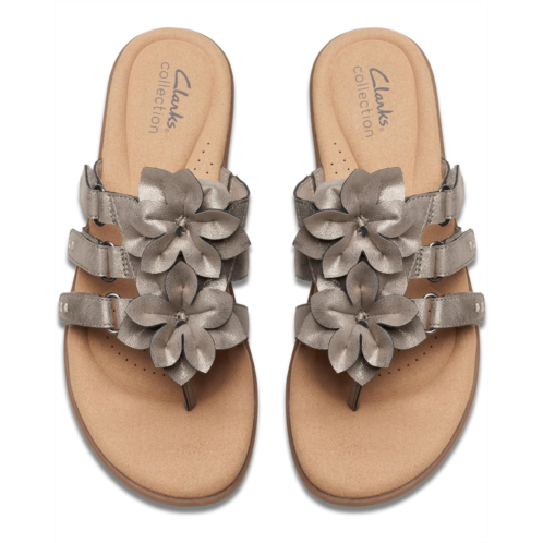 - Crafted with a leather upper with cut-out flower detailing, the Clarks Elizabelle Mae sandals offer a chic look. Offering superior comfort and style, the padded rubber footbed and mesh lining take your comfort to the next level. Easy to slip on and off, these toe-post style sandals feature a hook-and-loop strap closure that offers a custom fit. Flaunt your great style by wearing these stylish sandals.