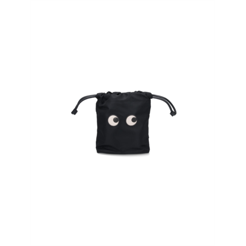 This playful bucket pouch from Anya Hindmarch is made from eco-friendly black Econyl fabric and features charming eye-shaped patches on the front. With tone-on-tone leather details and a secure drawstring closure, it's perfect for casual outings. The spacious interior is designed for stowing essentials, combining sustainability with modern style. - Material - Eco-friendly black Econyl fabric - Features - Eye-shaped patches, tone-on-tone leather details - Closure - Secure drawstring - Ideal for - Casual outings - Spacious interior for essentials