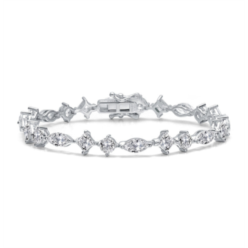 - A rigid bracelet in silver-plated metal, finished with faceted white crystals on each end.