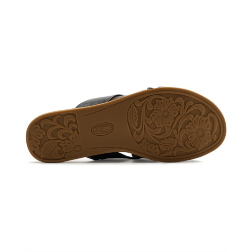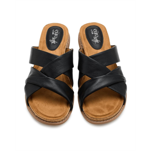 - The intersection of chic and chill, EuroSoft Eirene. Designed with a smooth faux leather upper and lining, this open-toe style slips on in seconds and feels luxe from the first step. A padded sock footbed delivers plush cushioning where you need it most, while the rubber insole and outsole provide dependable traction and flexibility for life on the go. The banded upper offers a secure, flattering fit, paired with a lightweight construction that keeps things breezy and wearable from morning errands to sunset strolls. Finished with a stacked wedge outsole, Eirene adds subtle lift without sacrificing comfort, so you get height, stability, and style in one streamlined silhouette.