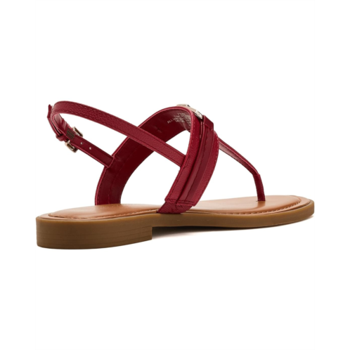 - The Tommy Hilfiger Cruman is a sleek everyday sandal featuring a comfortable footbed, buckle adjustable back strap, and polished logo hardware. Soft, versatile, and effortlessly refined, the flat features an open almond toe and a faux leather upper with polyester lining that delivers a polished yet easy-to-wear silhouette.