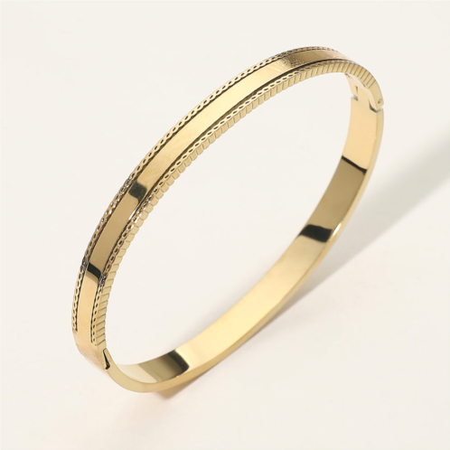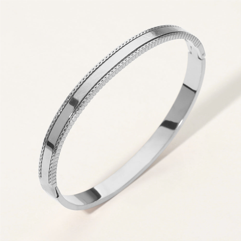 Size - 0.25' H, 2.3' DHinged ClosureWater ResistantSleek hinged bangle bracelet designed with a smooth polished surface and refined textured edge for subtle detail. Comfortable to wear and easy to style, it works beautifully alone or layered with other bracelets. Ideal for everyday wear, work outfits, gifting, and timeless accessory collections.