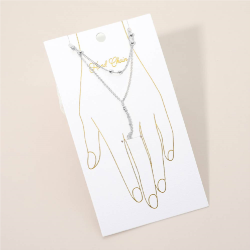 Size - 4.5' H, 7' + 2.25' LRing Size - FreeElegant hand chain bracelet designed with a smooth wrist chain connected to a delicate finger ring and subtle bead details. This refined accessory adds graceful movement and a modern silhouette to the hand. Ideal for boutiques, gifting, and everyday wear, offering a lightweight statement that complements casual looks, dressy outfits, and special occasions effortlessly.