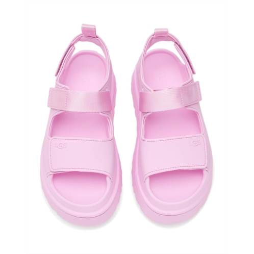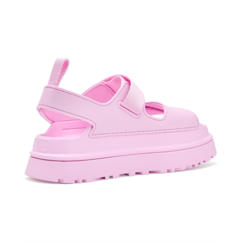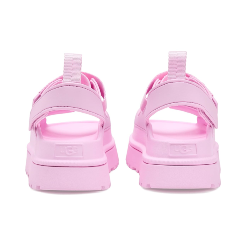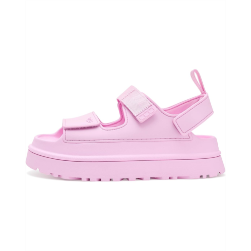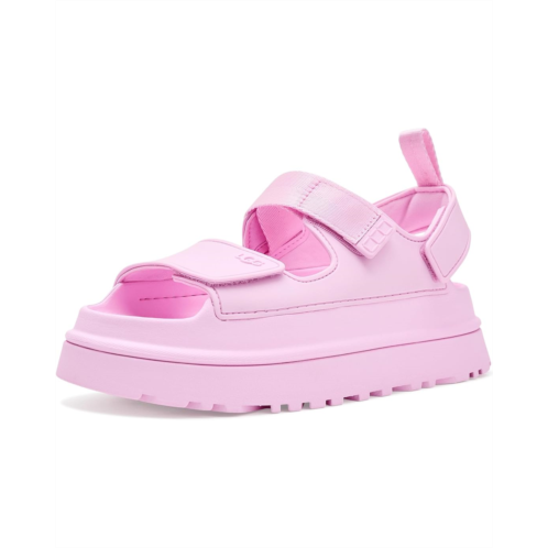 - Bring comfort to your feet by wearing the UGG Goldenglow sandals. The slip-on style sandals are super lightweight and ultra-comfortable. They have hook-and-loop closures for a custom fit, quarter strap webbing made from recycled polyester, an open round-toe design, stretchy back strap with an ankle pull tab for easy wearing. The sandals have TPU upper, textile lining made from recycled polyester fibers, and sugarcane EVA footbed and midsole for added comfort.