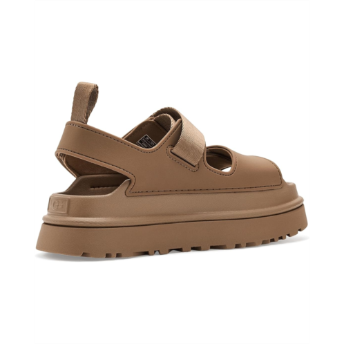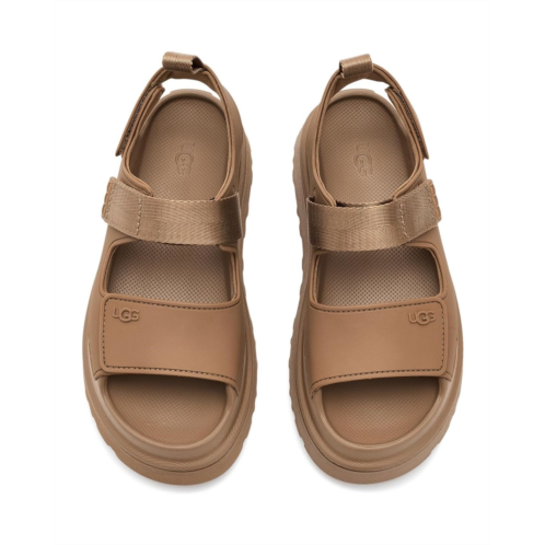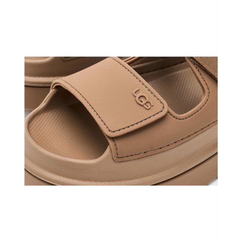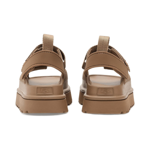 - Bring comfort to your feet by wearing the UGG Goldenglow sandals. The slip-on style sandals are super lightweight and ultra-comfortable. They have hook-and-loop closures for a custom fit, quarter strap webbing made from recycled polyester, an open round-toe design, stretchy back strap with an ankle pull tab for easy wearing. The sandals have TPU upper, textile lining made from recycled polyester fibers, and sugarcane EVA footbed and midsole for added comfort.