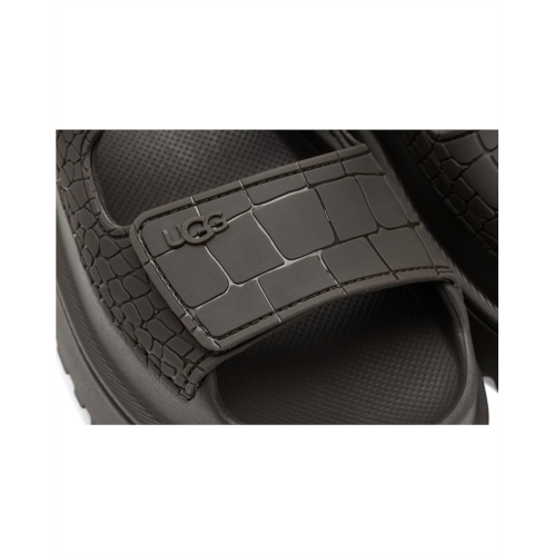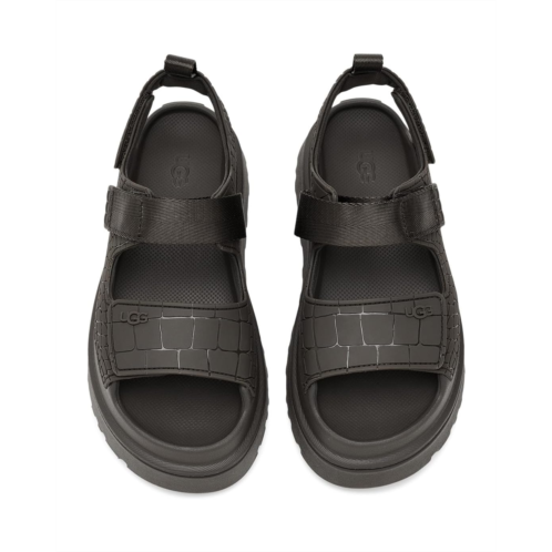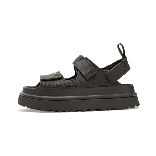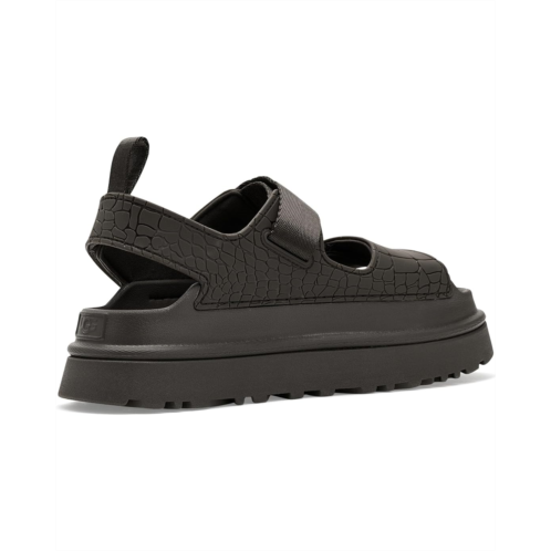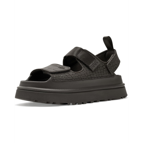 - Step into standout style donning the UGG Goldenglow Embossed, a sandal that celebrates individuality with every detail. Designed for those who love to make a statement, this eye-catching pair features a TPU upper with an embossed croc print. No two pairs are exactly alike, just like you. Inside, a soft cotton lining keeps things breathable and cozy, while the Ethylene Vinyl Acetate insole and outsole deliver cloud-light cushioning and all-day comfort. The outsole is crafted from ultra-lightweight sugarcane EVA, giving you a feel-good step that's lighter on your feet and the planet. Adjustable hook-and-loop closures ensure a secure, custom fit, perfect for days on the move. Finished with straps and an upper liner made from recycled fibers, the Goldenglow Embossed blends comfort, sustainability, and style into one iconic, confidence-boosting sandal you'll reach for again and again.