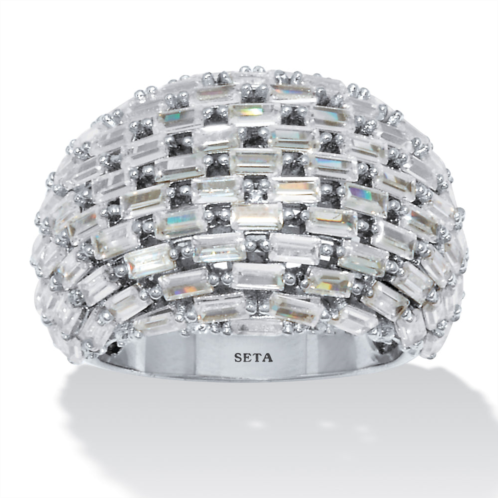 This striking ring features a dome design adorned with 6.06 carats of sparkling baguette and emerald-cut cubic zirconia stones, set in a sleek silvertone finish. Perfect for adding a touch of glamour and sophistication to any outfit, it's an eye-catching accessory for any occasion. 113 total stones, sizes 6-10.