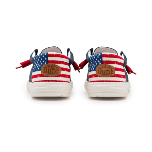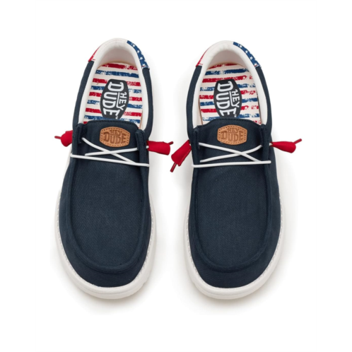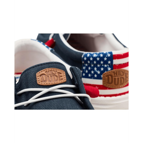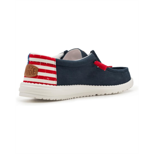 - Easy, breezy, textile makes this Hey Dude Wally Americana slip-on sneaker ready to roam. Easy-on elasticized laces, ethylene vinyl acetate outsole, and removable insole provide go-to comfort. Flex & Fold technology supports healthy feet with its unique shape, giving complete freedom of movement.