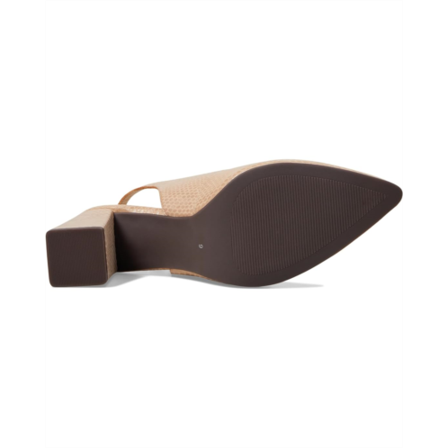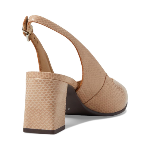 Adjustable slingback strap with buckle closure.