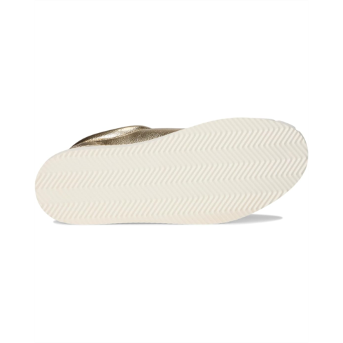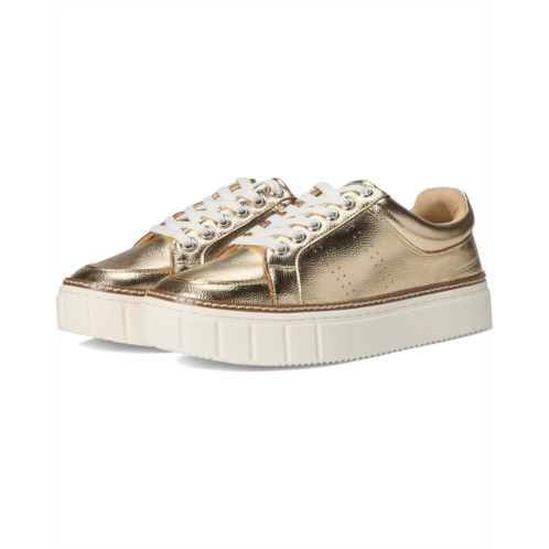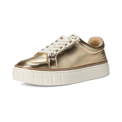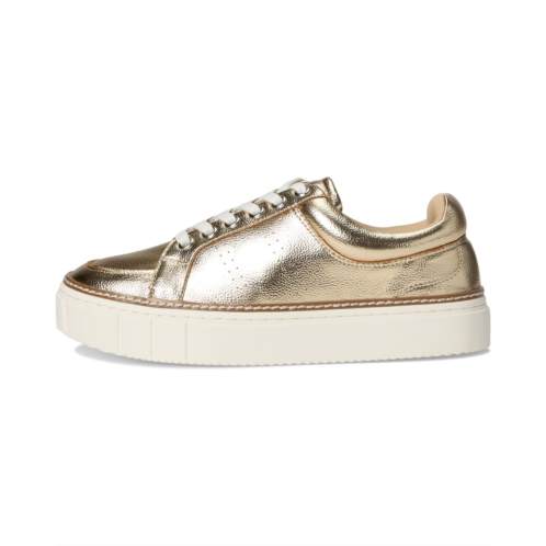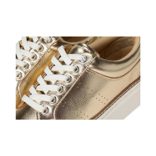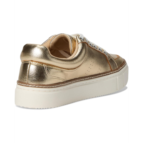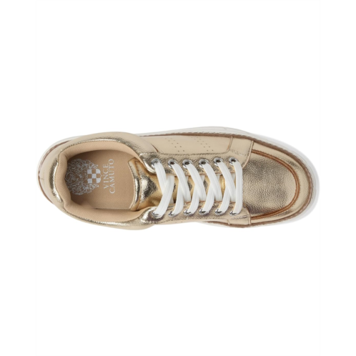 Shimmer into spotlight wearing the Vince Camuto Randay Platform Sneakers. This low top sneaker with classic lace profile sits atop a chunky, treaded platform giving a lift. It is constructed with leather upper and mesh fabric lining, padded collar, and removable cushioned insole. The finishing details include a tan trim with white contrast stitch and two perforated breathing stripes.