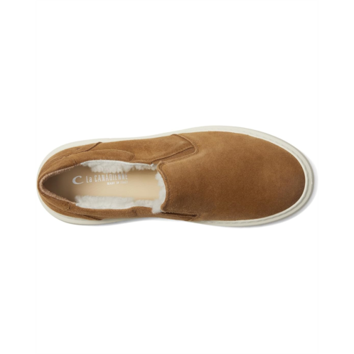 Suede sneaker with a cozy shearling lining, and light weight rubber sole. Easy, slip-on construction. Shearling trim details the opening. City Dry technology features waterproof Italian suede and a breathable shearling lining that keeps you comfortable whether indoors or outside. Cushioned memory foam insole. Handmade in Italy.