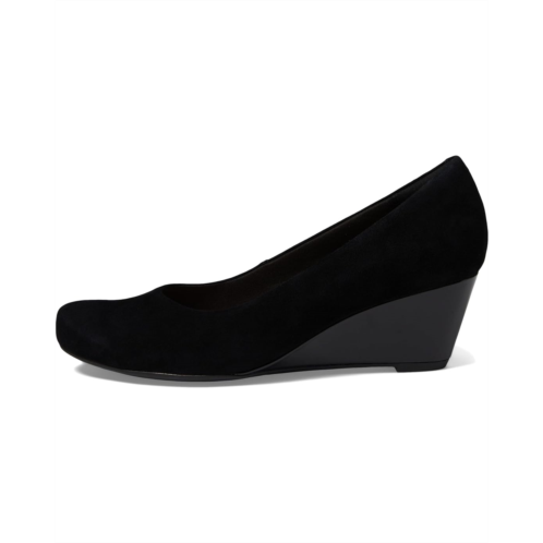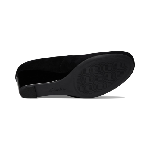 Step up in style and comfort by wearing the Clarks Flores Tulip heels. The slip-on low-top style heels have a closed round-toe design with statement wedges for an effortless look. The suede upper with synthetic lining and faux leather insole makes them comfortable to wear all-day long.