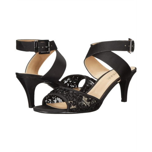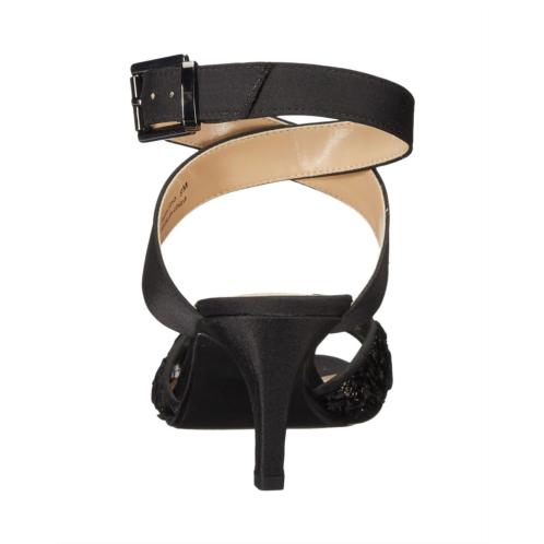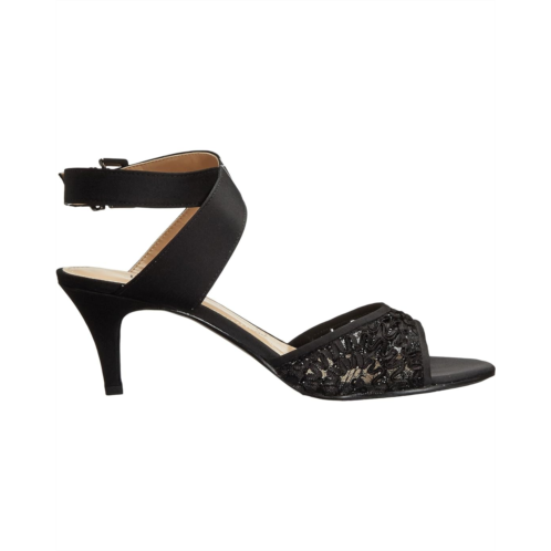 Available in multiple materials with an open toe and wrap-around straps at ankle.