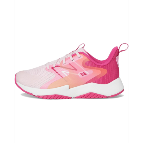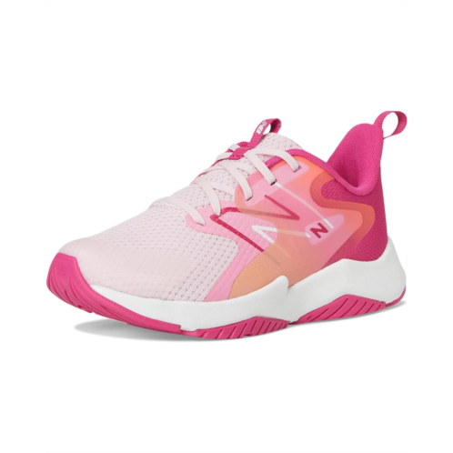 The New Balance Kids Rave Run v2 shoes are designed for active comfort with a lightweight injection-molded ethylene vinyl acetate foam midsole that delivers soft cushioning, a breathable mesh and synthetic upper with no-sew overlays for a sleek fit, and a no-sew tip that reinforces high-wear zones for added durability.