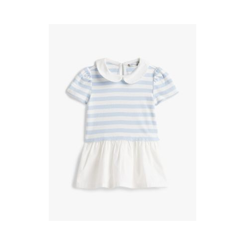 - Peter Pan collar, keyhole closure at back, short sleeves, knit top, woven skirt.