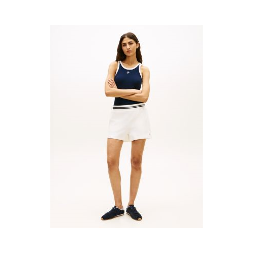 Tommy Hilfiger women's short. Our comfortable sweatshorts feature a ribbed elastic waistband with striped tipping for a sporty touch. Even better, this pair has been garment-washed for added durability and softness.