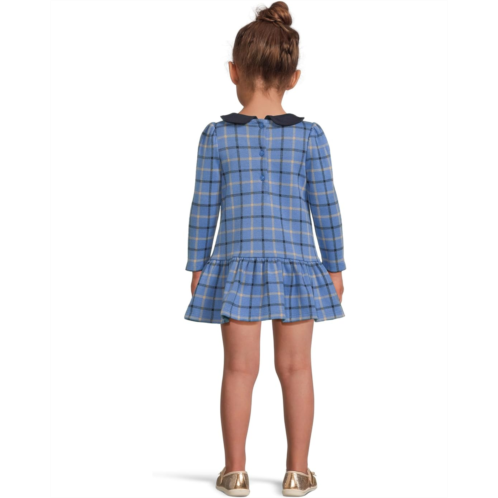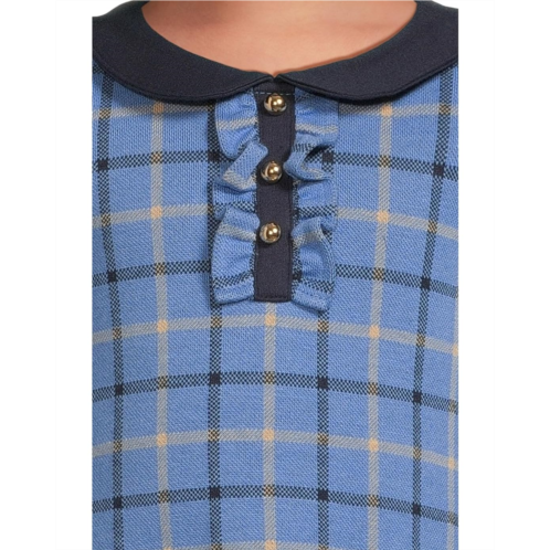 The Janie and Jack Jacquard Plaid Dress is a stylish, knee-length dress featuring bow detail with gold-tone hardware. Its cotton fabric offers all-day comfort. This patterned dress is designed with long sleeves, a buttoned back closure, a collared neckline, and a pleated hem.