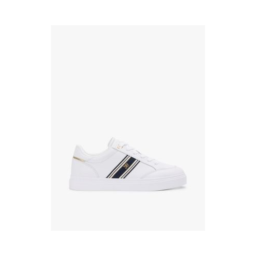 Tommy Hilfiger women's sneaker. Put your best foot forward with our leather sneakers, designed with a webbing stripe and gleaming metallic accents. The durable cushioned cupsole keeps you comfortable and supported in every step.