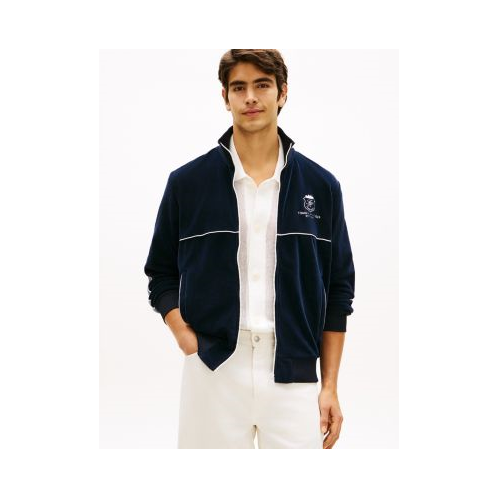 Tommy Hilfiger men's sweatshirt. Made from smooth velour, this monogram crest track jacket combines a retro-inspired edge with a soft, comfortable feel perfect for errands or lounging.