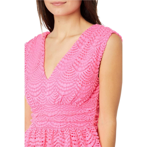 Embrace whimsical elegance in the Lilly Pulitzer Faye V-Neck Lace Ruffle Dress. With a captivating fit and flare silhouette, adorned with tiered ruffles and a scalloped hem, it exudes feminine charm. Featuring a deep V-neckline, sleeveless design, and tie closure for effortless allure.