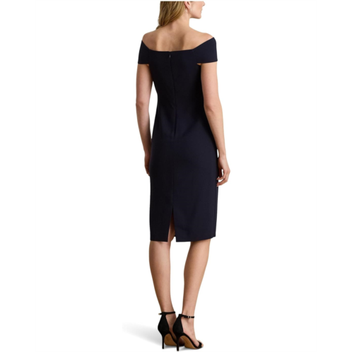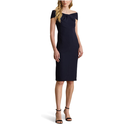 Make a sophisticated entry into any party or event wearing the Lauren Ralph Lauren Twist-Front Crepe Cocktail Dress. Crafted from a polyester blend, this midi dress is cut in a sheath silhouette and features pleats on the front of the neck. It is styled with cap sleeves, an off-the-shoulder neckline with a twist front detail, a skirt slit at the center back, and a straight hem. The center front vertical seam and front and back panel seams add to its comfort and durability. Fully lined, this sheath dress has a concealed zippered back closure with a hook-and-eye closure for easy on and off.